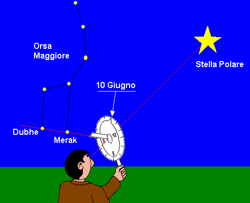 Una volta portata la lancetta sul 10 Giugno, si punta il notturnale verso la Stella Polare tenendolo per il manico