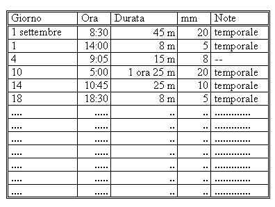 I dati riguardanti la pioggia: giorno e ora, durata e mm di acqua, devono essere trascritti su una tabella e