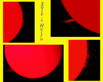 PER OSSERVARE IL SOLE NELLA LUNGHEZZA D'ONDA DELL'IDROGENO-ALFA, OCCORRE DOTARSI DI UN TELESCOPIO SPECIFICO, COSTRUITO APPOSITAMENTE PER QUESTO USO. LA FOTO A CORREDO E' UN COLLAGE DI PIU' RIPRESE OTTENUTE CON UN TELESCOPIO SOLARE CORONADO-PST ED UNA MACCHINA FOTOGRAFICA DIGITALE OLYMPUS. CON TALE STRUMENTO SI POSSONO OSSERVARE LE PROTUBERANZE (GETTI DI IDOGENO AD ALTA TEMPERATURA), I FILAMENTI CHE SONO PROTUBERANZE VISTE PROIETTATE SULLA FOTOSFERA, LA GRANULAZIONE FOTOSFERICA E I FLARE CHE SONO GETTI DI MATERIA ALTAMENTE ENERGETICA.