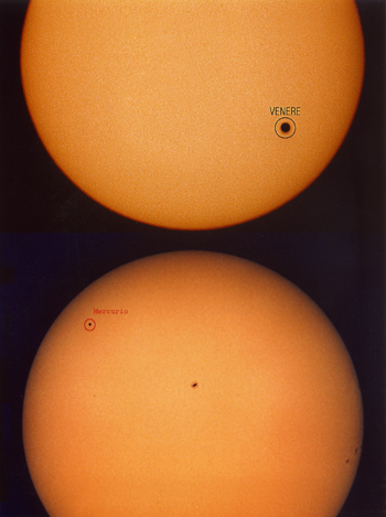 L'immagine composta ritrae sia il transito di venere che quello di mercurio, avvenuti alcuni anni fa. Non essendo un fenomeno consueto, gli appassionati non se lo lasciano scappare!!