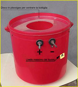 Prima di attivare l’elettrolisi occorre immettere il liquido nel secchio, che è composto da acqua potabile (non minerale), che avendo una bassa conducibilità elettrica, occorre addizionarla con soda