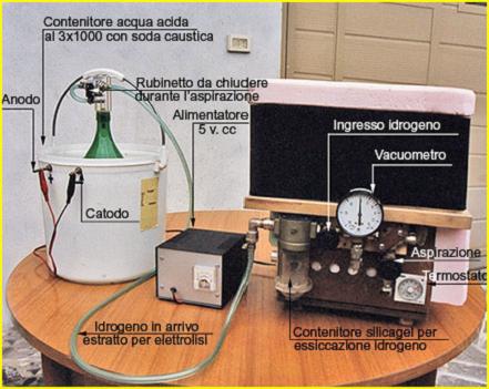 minuti si chiuderà l’aspirazione, si aprirà l’idrogeno che saturerà l’ipercamera fino a pressione ambiente (vacuometro a zero): chiuderemo di nuovo l’idrogeno (rubinetto sul collo della bottiglia),