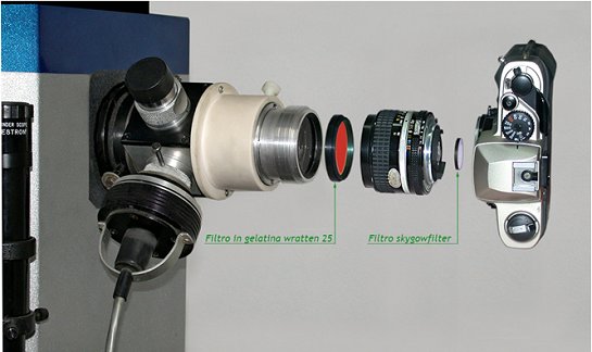 I filtri usati anche in queste riprese sono due: come si può vedere nella foto, il primo filtro in gelatina rosso wratten 25 è avvitato davanti all’obiettivo della fotocamera, e il filtro di contrasto Skyglowfilter, privo della sua montatura è sistemato dietro l’obiettivo della fotocamera, dove basta un diametro inferiore. Questo filtro avendo un diametro da 31.8 mm svolge il suo lavoro alla stessa maniera del più costoso 50.8.