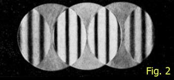 Adoperando un reticolo con questa frequenza e una sorgente di luce monocromatica si eliminano tutte le frange d’ombra iridate e di ordine superiore che sovrapponendosi sono da considerarsi un disturbo. Le frange rimanenti, essendo acromatiche, sono ben contrastate e nette permettendo una correzione sul fronte d’onda molto spinta come si vede nell'interferogramma di Fig. 2, dove il disco centrale rappresenta l’onda diffratta di ordine 0, a destra l’onda di ordine +1 e a sinistra l’onda di ordine -1. Nella sovrapposizione delle onde diffratte, all’interno delle lunule si formano le frange d’ombra che ci dicono quanto e dove deve essere corretto il fronte d’onda di tutto il nostro sistema ottico. Va detto inoltre che il reticolo rileva qualsiasi errore normale ai suoi tratti, perciò per essere sicuri che non ci sia astigmatismo, introdotto da un errore zonale, ovvero per far sì che l’onda sia una figura di rivoluzione intorno al suo asse, si dovrebbe necessariamente ruotare l’elemento in lavorazione più volte di 90° durante il controllo. Se dopo la rotazione dell’elemento, le frange d’ombra non cambiano posizione, va tutto bene, altrimenti se si inclinano rispetto alla posizione precedente, o addirittura si capovolgono durante l’avvicinamento del reticolo al fuoco, siamo in presenza di astigmatismo più o meno marcato, ovvero l’elemento in lavorazione non è una figura di rivoluzione. Nel punto in cui le frange si distanziano tra loro inclinandosi e allargandosi, vuol dire che la superficie in quel punto tende ad essere cilindrica introducendo questo tipo di aberrazione, che non può essere tollerata. Per il “fai da te”questo errore è tipico delle lavorazioni manuali, perché non si esercita sempre la stessa pressione ad ogni movimento di “vai e vieni”. Per questo motivo è preferibile costruirsi una robusta macchina che assolva al lavoro. Quando le frange che si formano nelle due lunule all’interno del disco centrale sono rettilinee, parallele ed equidistanti, si può essere sicuri della nostra lavorazione.