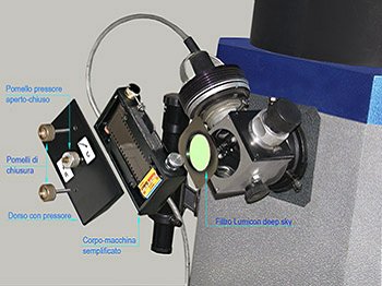 In questo semplice corpo macchina, la pellicola è spianata e mantenuta tale per tutto il tempo di posa, da un pressore a molla comandato dall’esterno che viene sollevato solo per consentire il trascinamento della pellicola. Dato che il filtro Lumicon (a f/5) allunga il fuoco di 0,8 mm, questo è applicato ad una lastrina di vetronite di detto spessore, che al suo inserimento fa arretrare il corpo macchina senza dover ripetere la messa a fuoco riducendo i tempi di lavoro.