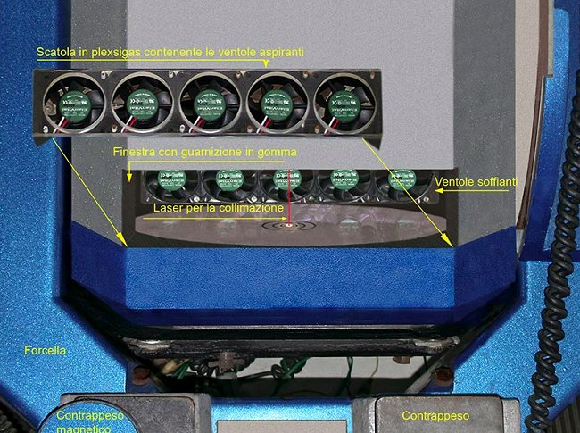 Le ventoline una volta allineate e scatolate dovranno accostare in maniera ermetica al tubo del telescopio, mediante interposizione di una guarnizione di gomma che smorza anche eventuali vibrazioni.